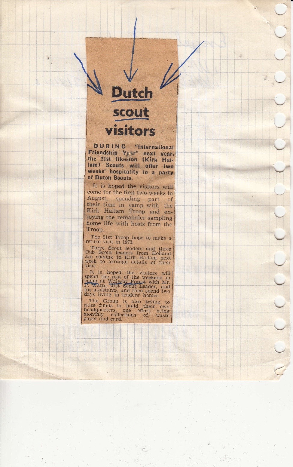 In 1970 hebben de verkenners deel genomen aan de Jamborette in Amersfoort.Dit is zo goed bevallen dat in 1971 al snel het idee in uitvoering werd gebracht om naar het buitenland te gaan. De keuze viel op Engeland. Er werd een oproep geplaatst in het Engelse scoutingblad waar een aantal reacties op kwamen. Een van de reacties was van de 21e Ilkeston scout group. Het klikte direct en al snel werden concrete plannen gemaakt. Het plan was om twee weken naar Engeland te gaan.